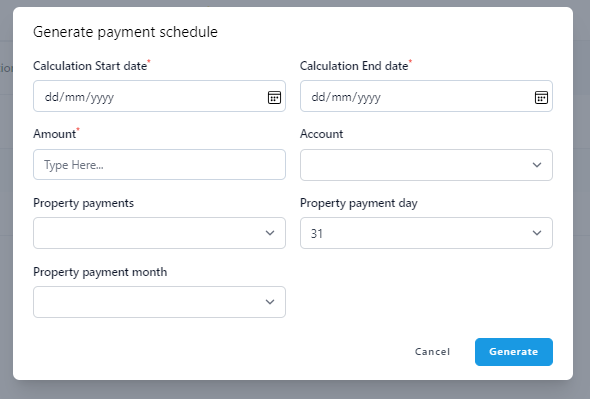 From the view you can fill in the information regarding the payments and the currency and the account related to the payments. When you have filled in the information, click "Generate" and when the complete payment schedule view opens, just click 'Save' after checking the data.