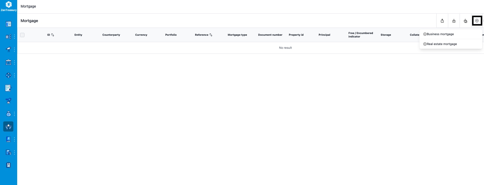 Step 1: Go to the Mortgage module and click the + icon on top right. Select 'Business mortgage' or 'Real estate mortgage'.