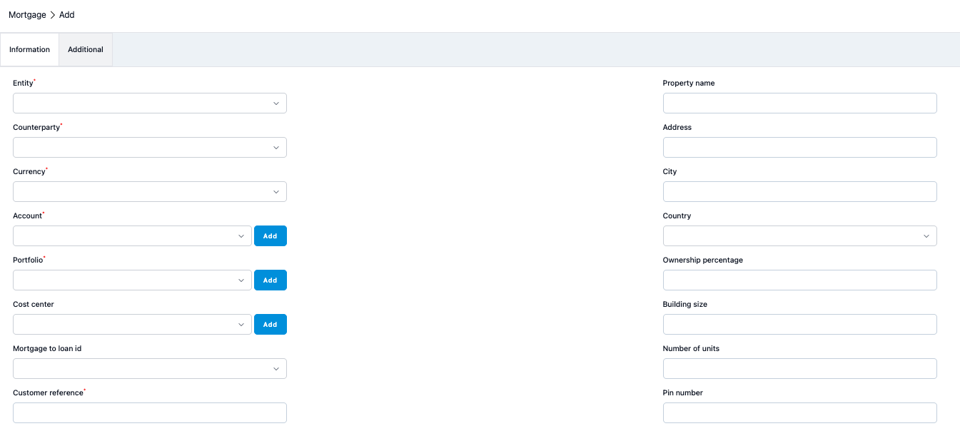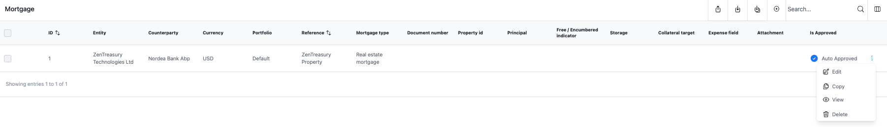 Creating a mortgage agreements in ZenTreasury requires prior setup of relevant Entity, Counterparty, Portfolio, Cost Center and Bank Accounts. New mortgage can be created manually, or by copying an existing one and changing the needed information.