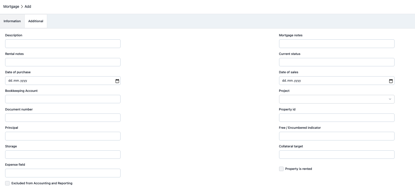 On fields Document number, Principal, Storage and Expense field you can fill more details related to the mortgage.