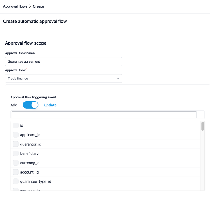 - Selecting for the approval flow triggering event. By default, the selection is 'Add' meaning that whenever an item is added on the module or function as selected for the approval flow, it triggers the approval flow. If selected “Update” you can define the exact triggering field or data detailed on the list.
