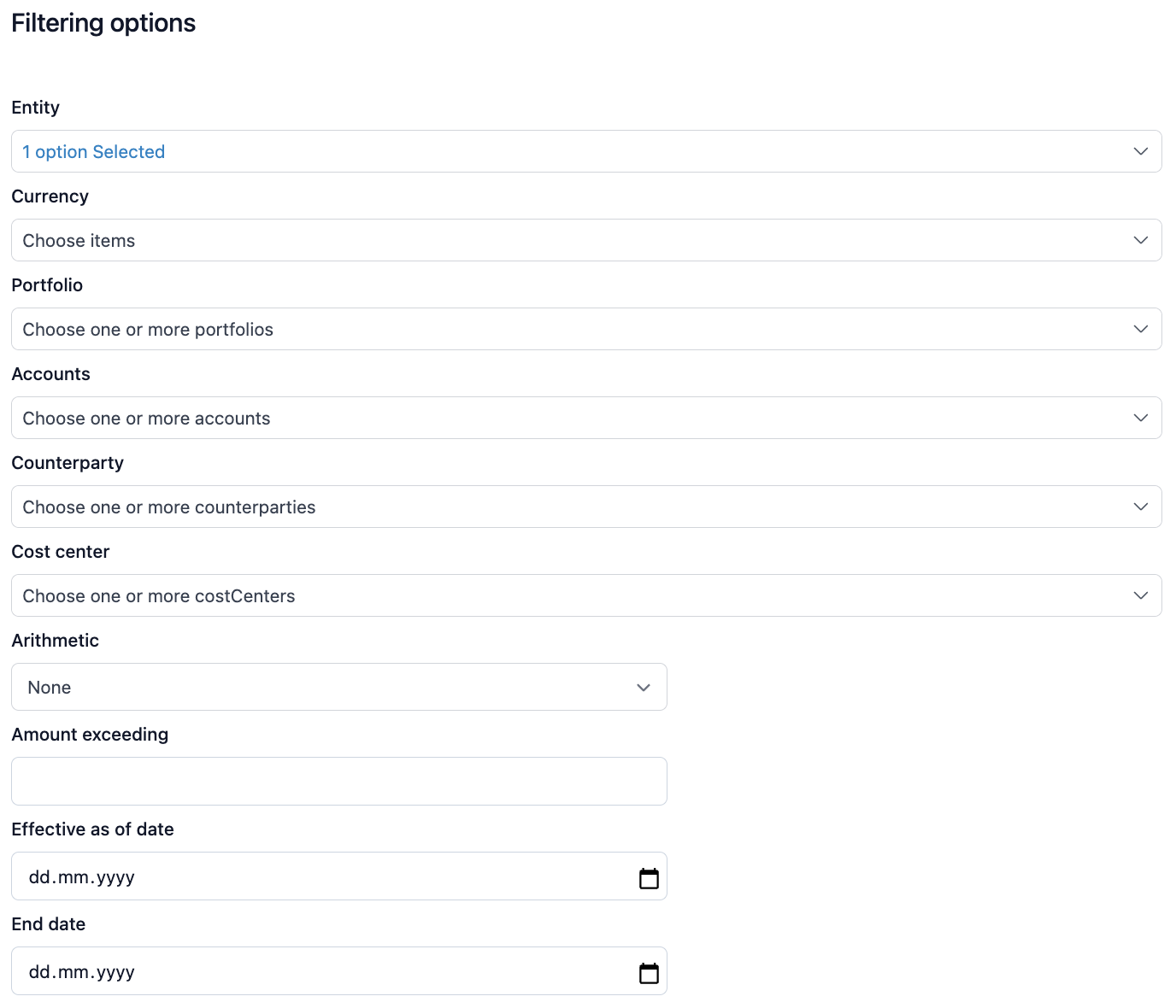 - Next, you can add the filtering options for your approval flow by selecting entity, currency, portfolio, accounts, counterparty, cost center, selection related to the threshold amount and effective dates.