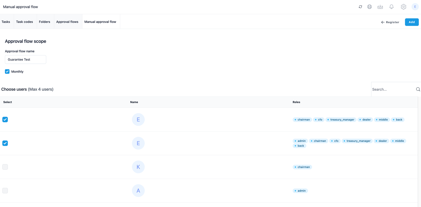 - And finally, choose the users who are linked to the approval flow. After selecting the users, you can determine the approval flow order and save the flow by selecting add.