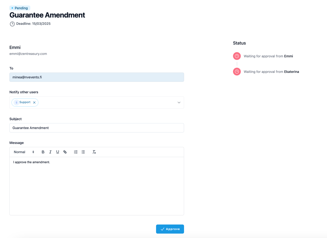 After saving the approval flow, you will see 'Pending' status related to the event that triggers the flow. Here, as the approval flow was set for adding a guarantee agreement, the pending status is signalled after creating a new guarantee agreement.