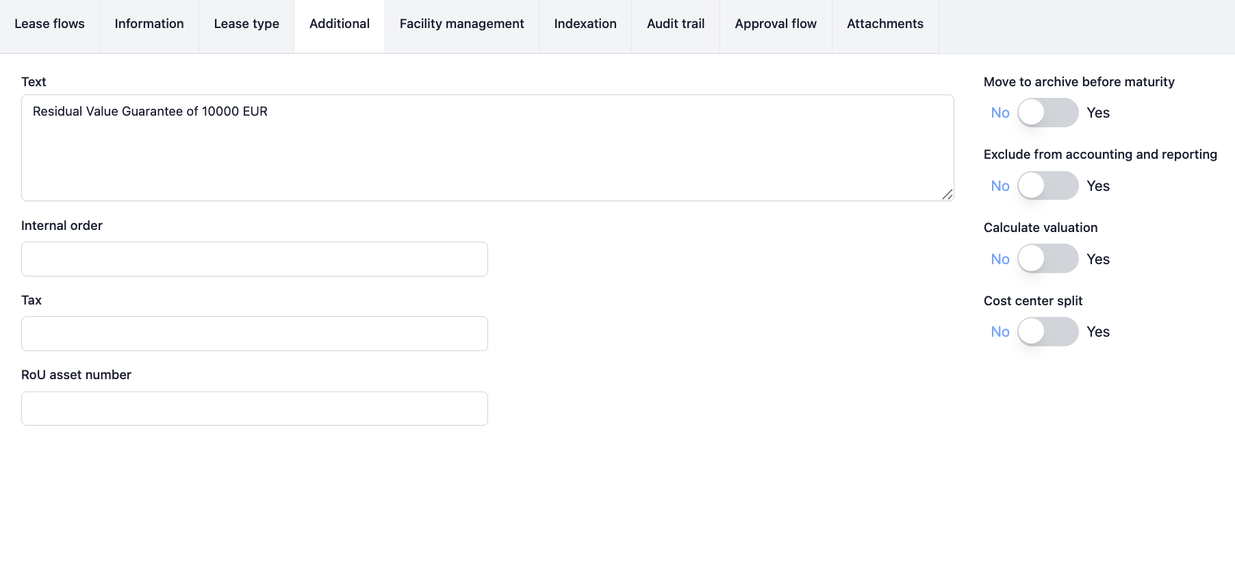 Same as in 1.A, you can add the information about the residual value guarantee under the Additional tab in the Text field.