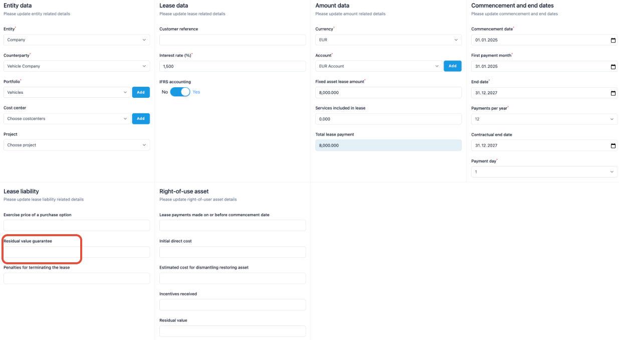1.A The estimate of the residual value at lease term end comes in and it is higher than the residual value guarantee. E.g. it’s estimated to be 15 000 € on 31.12.2027. Because the estimate is higher than your guarantee, you should enter the lease normally and leave the Residual value guarantee field empty.