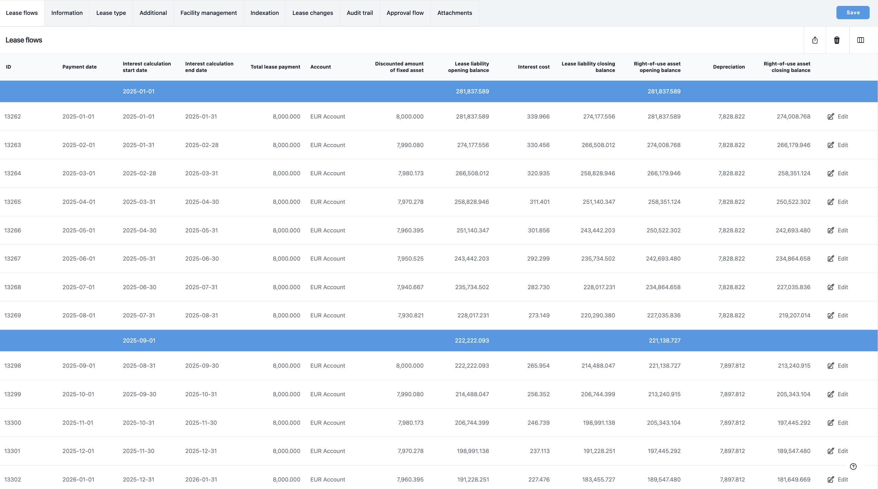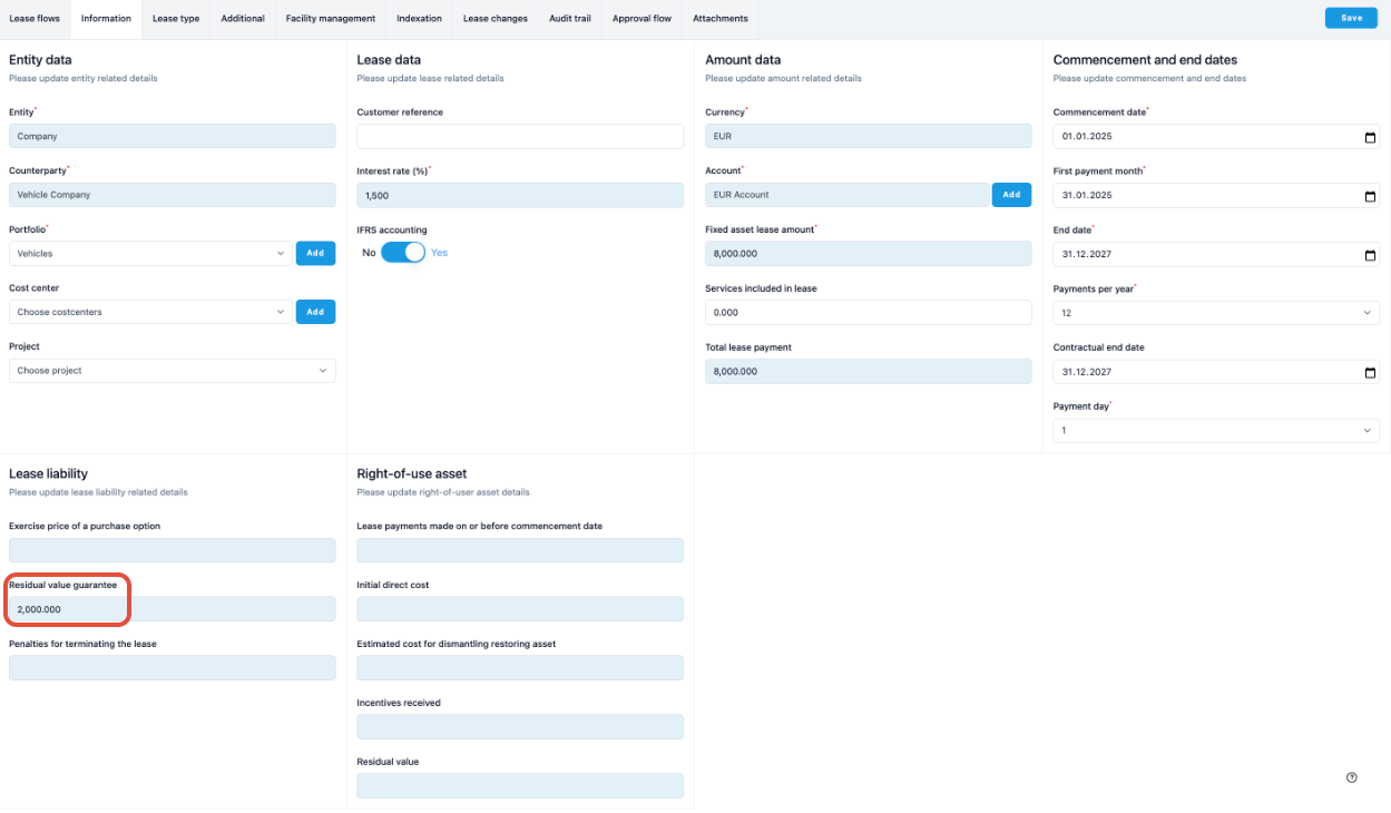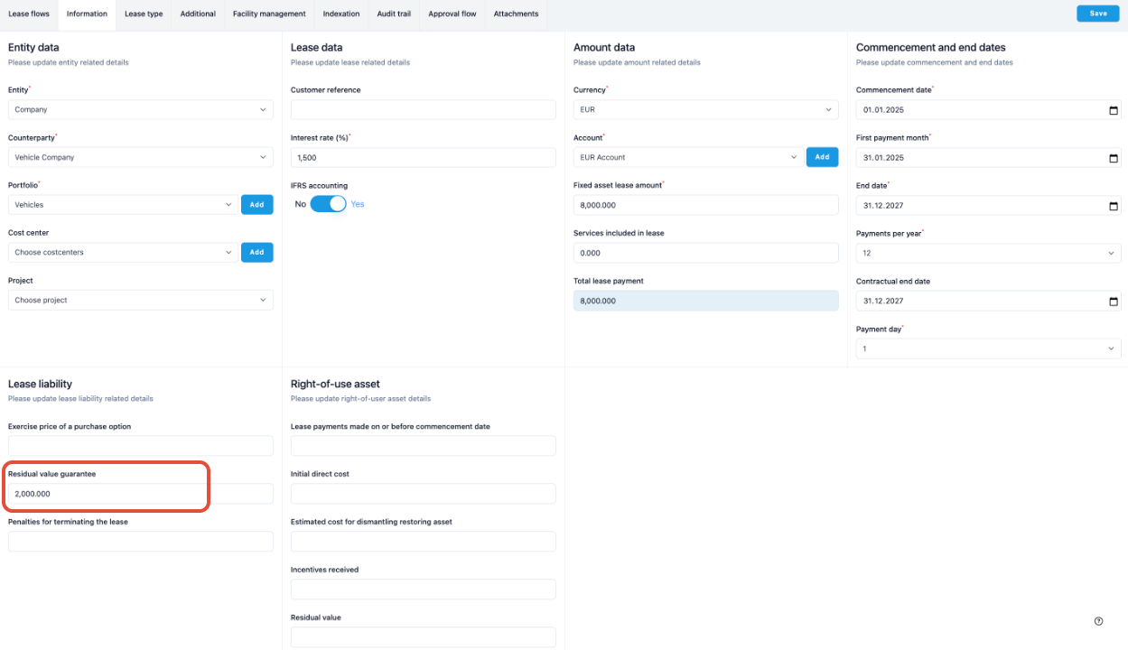 Formula: Value for Residual value guarantee field (2 000 €) = Residual value guarantee (10 000 €) - Estimate of residual value at lease term end (8 000 €). Press save.