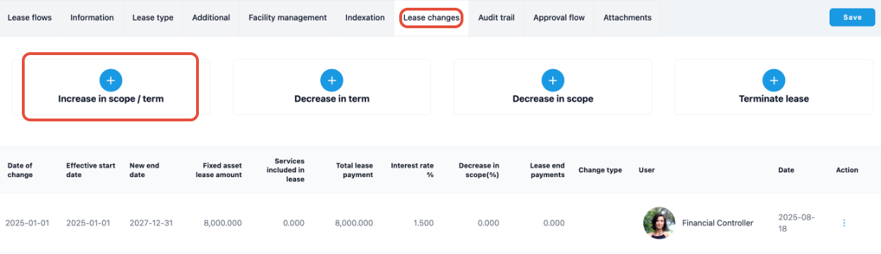 Let’s say in this example that the estimated residual value at lease term end was 15 000 € (above residual value guarantee), but it is now updated to 8 000 € (below residual value guarantee), the following lease change should be made: