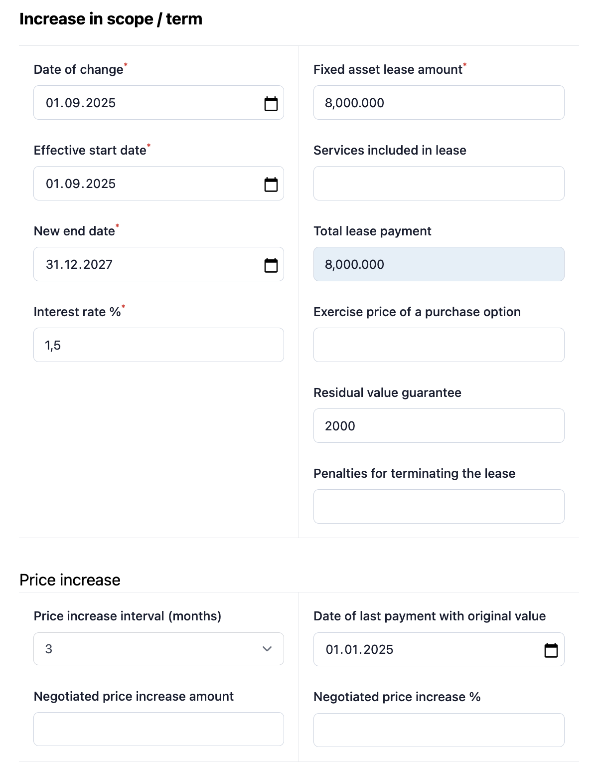 1.C The estimate of the residual value at lease term end comes in and it is lower than the residual value guarantee. It’s estimated to be 8 000 € on 31.12.2027. Because the estimate is lower than your guarantee, you should enter the difference between Residual value guarantee and estimated residual value in the Residual value guarantee field.