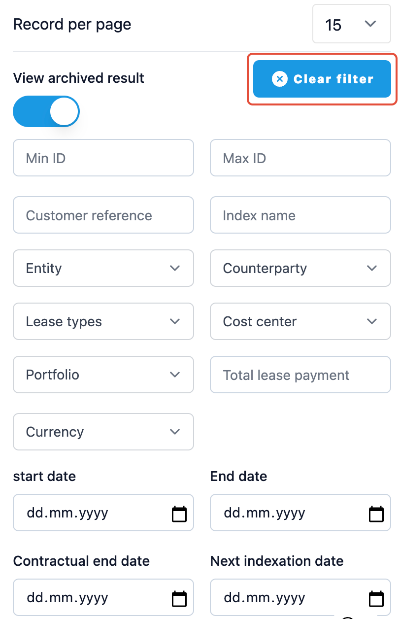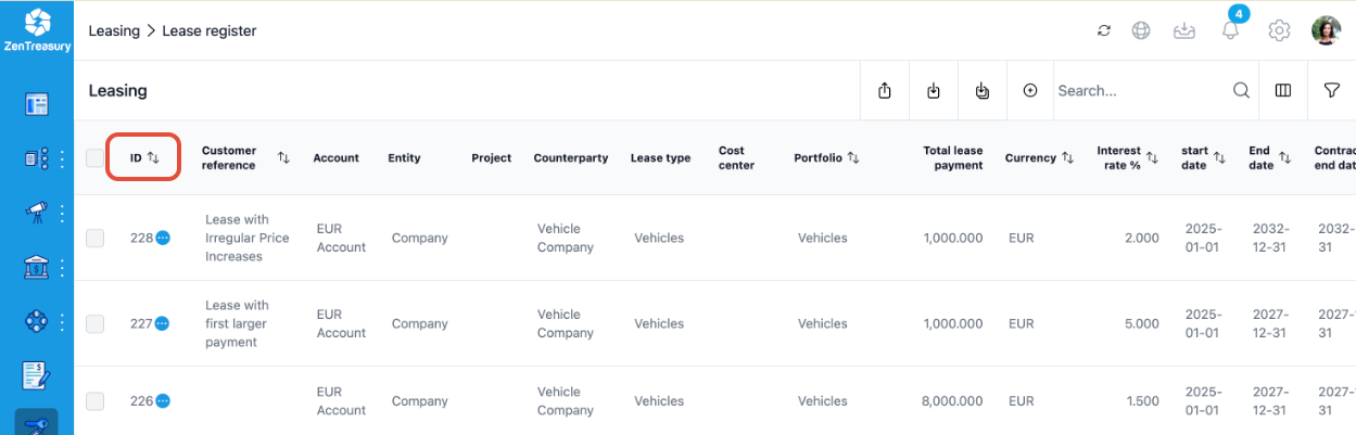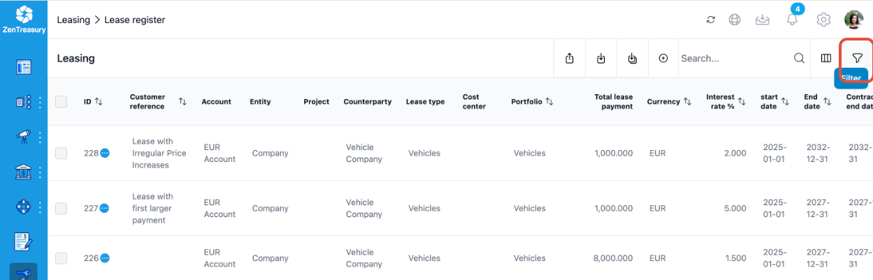 Not all leases that you add to ZenTreasury will be visible in the lease registry without using filters. Only active leases (ongoing and starting in the future) will be shown by default.